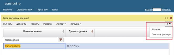 Чтобы убрать фильтр и увидеть весь список баз тестов, можно нажать крестик в строке фильтра (Рис.5) или нажать на стрелку в правом верхнем углу программы и выбрать пункт «Очистить фильтры» (Рис.6).