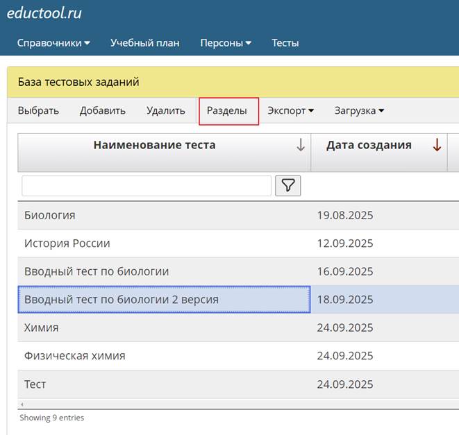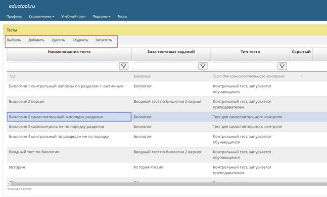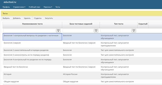 Рис.33. Пункт меню «Тесты». Список тестов, созданных пользователем