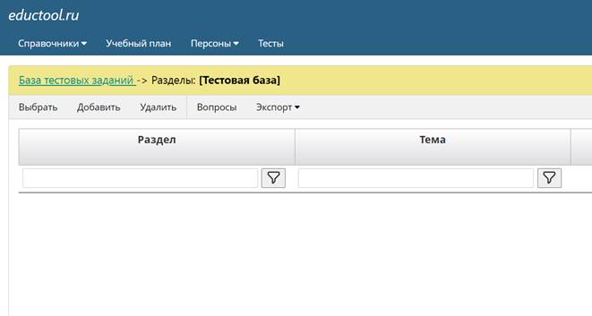 На странице «Разделы» по кнопке «Добавить» можно ввести наименование раздела и темы для БТЗ. По кнопке «Выбрать» можно отредактировать данные. По кнопке «Удалить» удалить выбранные строки, если к ним еще не добавлены вопросы. По ссылке «База тестовых заданий» можно вернуться к списку БТЗ (Рис.8).