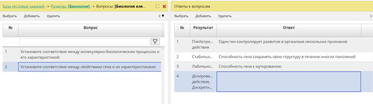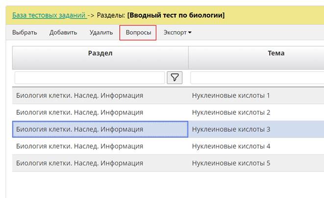 Рис.9. Переход к вводу вопросов для темы «Нуклеиновые кислоты 3»