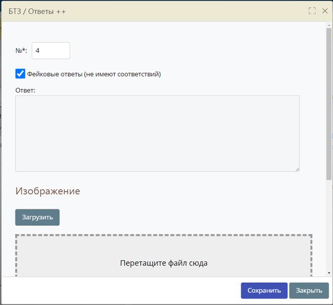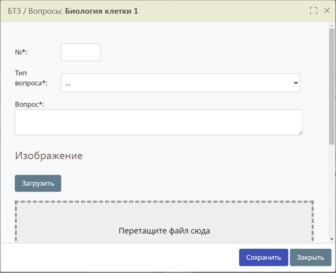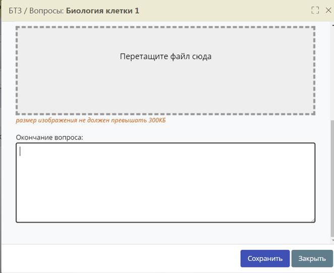 В поле № нужно ввести порядковый номер вопроса в данном разделе БТЗ. Вопрос теста может содержать так же изображение. Для добавления файла изображения можно перетащить его в соответствующее поле на форме ввода данных или воспользоваться кнопкой «Загрузить». В поле «Окончание вопроса» можно ввести текст, если вопрос теста содержит какой-то текст, затем картинку, а затем продолжение текста вопроса. Таким образом можно расположить картинку в середине текста вопроса.