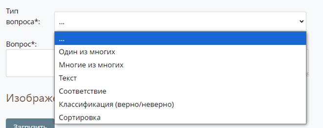 На форме для ввода вопроса теста необходимо выбрать тип вопроса из выпадающего списка. Система eductool поддерживает 6 типов вопросов (Рис.12).