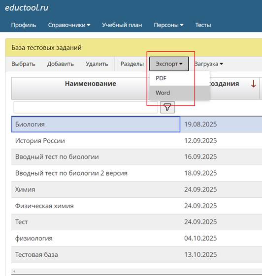 После ввода разделов, вопросов и ответов в БТЗ, можно выгрузить всю базу тестов или конкретный раздел в виде файла. Раздел можно выгрузить в файл формата pdf, БТЗ можно выгрузить в файл формата pdf или docx. Кнопка «Экспорт» для выгрузки файла находится на странице со списком разделов и на странице со списком БТЗ (Рис.16).