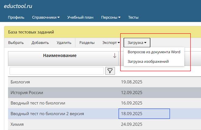 Базу тестов можно загрузить из файла Word, оформленного по специальному шаблону. Файл шаблона (образец оформления БТЗ для загрузки) прилагается к данной инструкции (Приложение в конце текста инструкции). Файлы картинок также можно загрузить с компьютера в БТЗ после того как будет успешно загружен файл Word.
