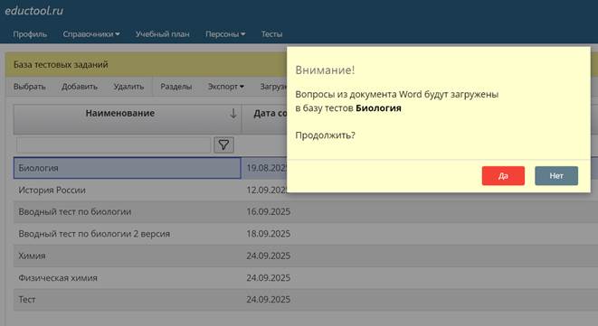 Рис.17. Подтверждение загрузки файла в выбранную базу тестов