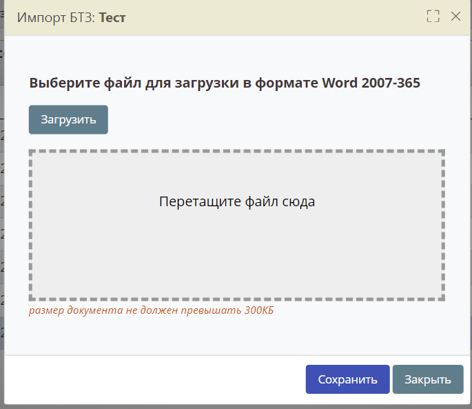 Для загрузки файла БТЗ нужно нажать кнопку «Загрузка» на странице со списком БТЗ (Рис.17).