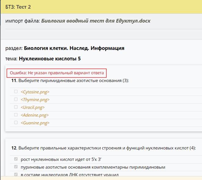 После выбора файла и нажатия кнопки «Сохранить» появляется форма для проверки правильности загружаемых данных. Если в каком-то разделе или вопросе теста есть ошибки, не позволяющие загрузить файл в систему, на данной форме можно будет увидеть в каком вопросе допущена ошибка. Описание ошибки будет отображаться красным шрифтом.