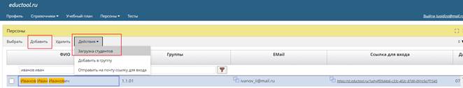 После сохранения данных о персоне, будет автоматически создана и отобразится в списке персон (столбец номер 4) ссылка для входа обучающегося в программу Едуктул. Эта ссылка будет постоянно действующей для одного обучающегося. По ней обучающийся попадет в свой личный кабинет обучающегося, где будет видеть и проходить все тесты, созданные для него преподавателем.