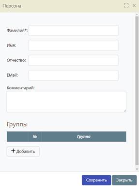 По кнопке «Добавить» открывается форма для добавления и редактирования данных о персоне (Рис.23).