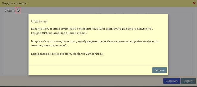Для добавления персон массово, нужно перейти в пункт меню «Действия» - «Загрузка студентов». Откроется форма для ввода данных. На этой форме в левом верхнем углу, рядом с наименованием поля «Студенты» есть кнопка «?». При нажатии на эту кнопку открывается окно с подсказкой, как правильно вносить данные (Рис.25).