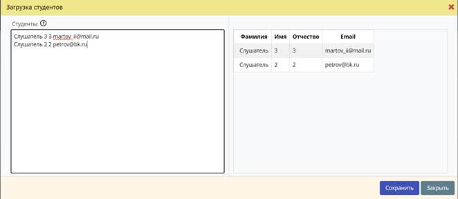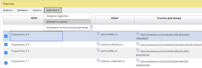 Персоны, добавленные в программу, можно массово распределить в разные группы. Также можно массово отправить ссылки для входа в программу обучающимся на их электронные почты.