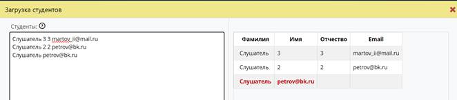 Если данные в какой-то ячейке таблицы введены неверно, они будут отображаться красным шрифтом (Рис.27). Если у обучающегося нет имени или отчества, нужно заменять их при вводе данных знаком тире или любым другим.