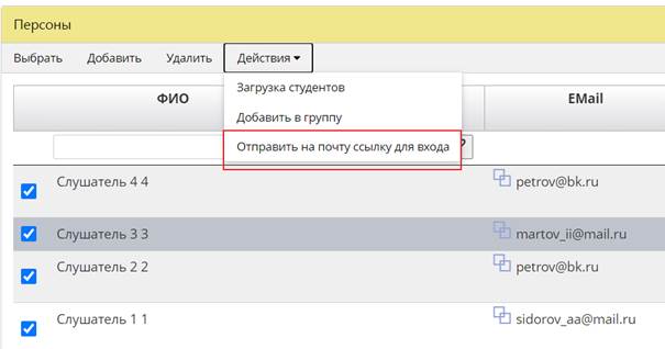 Для массовой отправки ссылок для входа в программу обучающимся на их электронные почты нужно в столбце «ФИО» в списке персон проставить галки (флажки) рядом с ФИО тех, кому будут отправлены письма, и нажать кнопки «Действия» - «Отправить на почту ссылку для входа» (Рис.31).