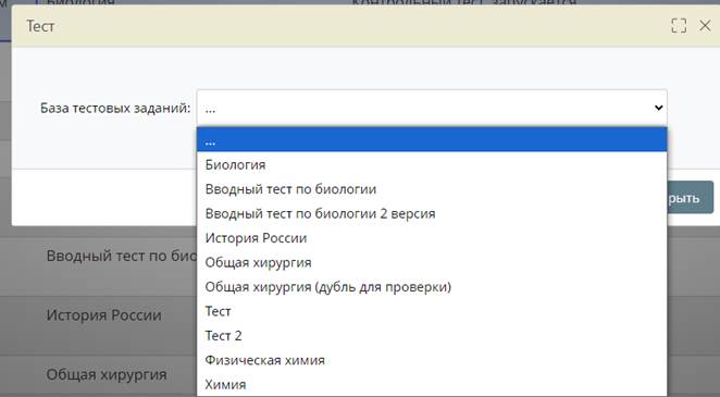 Новое тестирование создается по кнопке «Добавить». На форме добавления нового тестирования сначала выбирается из выпадающего списка база тестовых заданий. В выпадающем списке отображаются наименования всех БТЗ, созданных пользователем в разделе «Справочники» - «База тестовых заданий» (Рис.34).