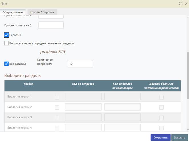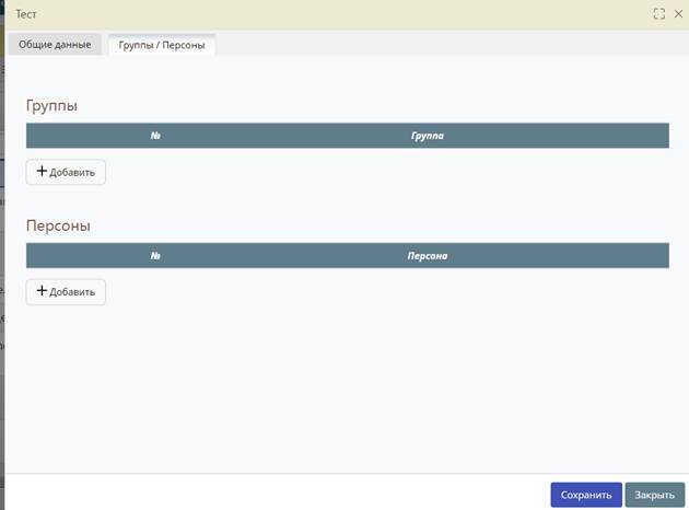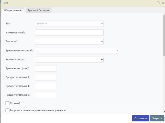 После выбора БТЗ на форме отобразятся новые поля для ввода данных (Рис.34). Форма состоит из двух закладок «Общие данные» (здесь задаются необходимые параметры для теста) и «Группы/Персоны» (здесь назначаются обучающиеся, которые будут проходить данный тест.