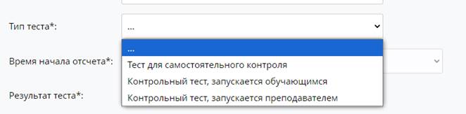 В следующем поле «Время начала отсчета» выбор значения предусмотрен только для контрольного теста, который запускается преподавателем.