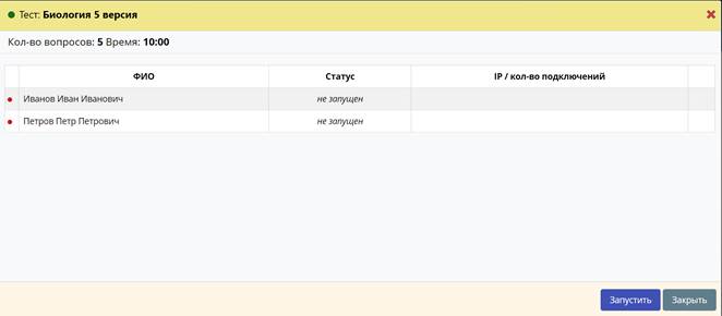 Если тест обучающемуся запускает преподаватель, и обучающийся в момент запуска находится на странице со списком тестов, у него появится окно с информацией о запуске ему теста. Он сможет запустить тест сразу из этого окна.