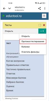 Рис.48. Кнопка для просмотра «Протокола тестирования»