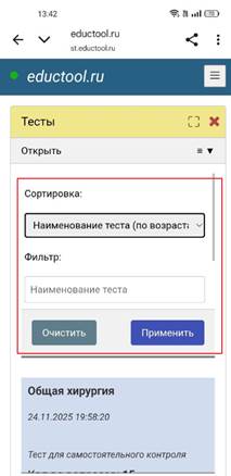 Рис.49. Сортировка и фильтр для поиска теста на смартфоне